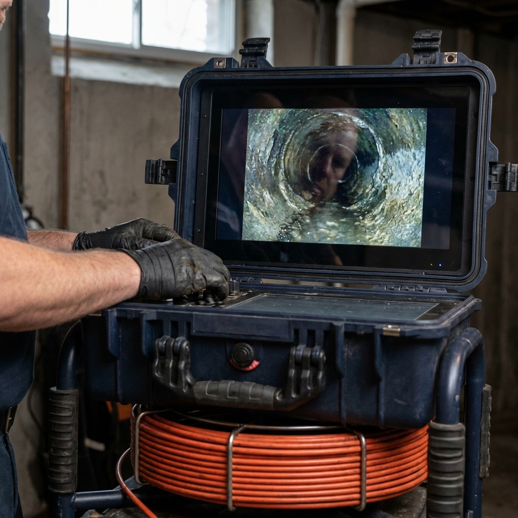 Recurring clogs, unknown sewer issues, pre-purchase due diligence — our HD sewer camera shows you exactly what's inside your line. Recorded video + written report, the same day. Flat-rate pricing, free phone quote.